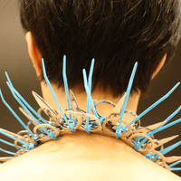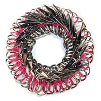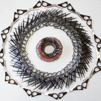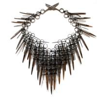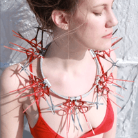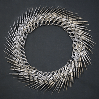 Rose constructed sculptures, exploring various forms, textures, and patterns with scissors and later razor blades. By repurposing these potentially dangerous objects, using zip ties [used as handcuffs during mass arrests] to hold them together, she explores the fine line between beauty and safety. The circle form is a recurring motif, symbolizing unity and interconnectedness inspired by ancient yantras, mandala forms and sacred geometry. The fine art sculptures evolved into temporary wearable pieces for photoshoots and couture events. Collars, bracelet cuffs, and breastplates are placed on the body as provocative under garments that expose the skin and vulnerability and beauty of the human form.